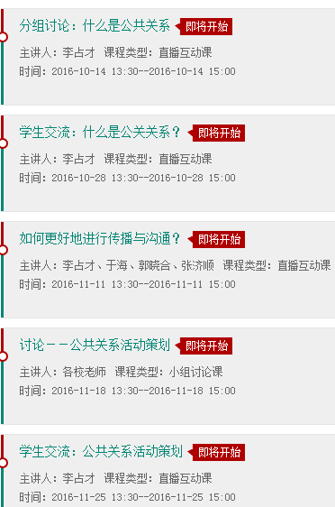 本课程有见面课,即网络课程教师将通过直播的方式授课,学生可以通过论坛与教师实时互动。《公共关系与人际交往》见面课时间为: