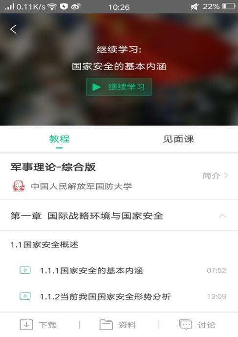 在“学习”中,点击“军事理论”-去学习,在弹出的页面中,上方为课程视频界面,点击即可播放视频、学习。下方为课程章节进度表,请按照进度表顺序学习。