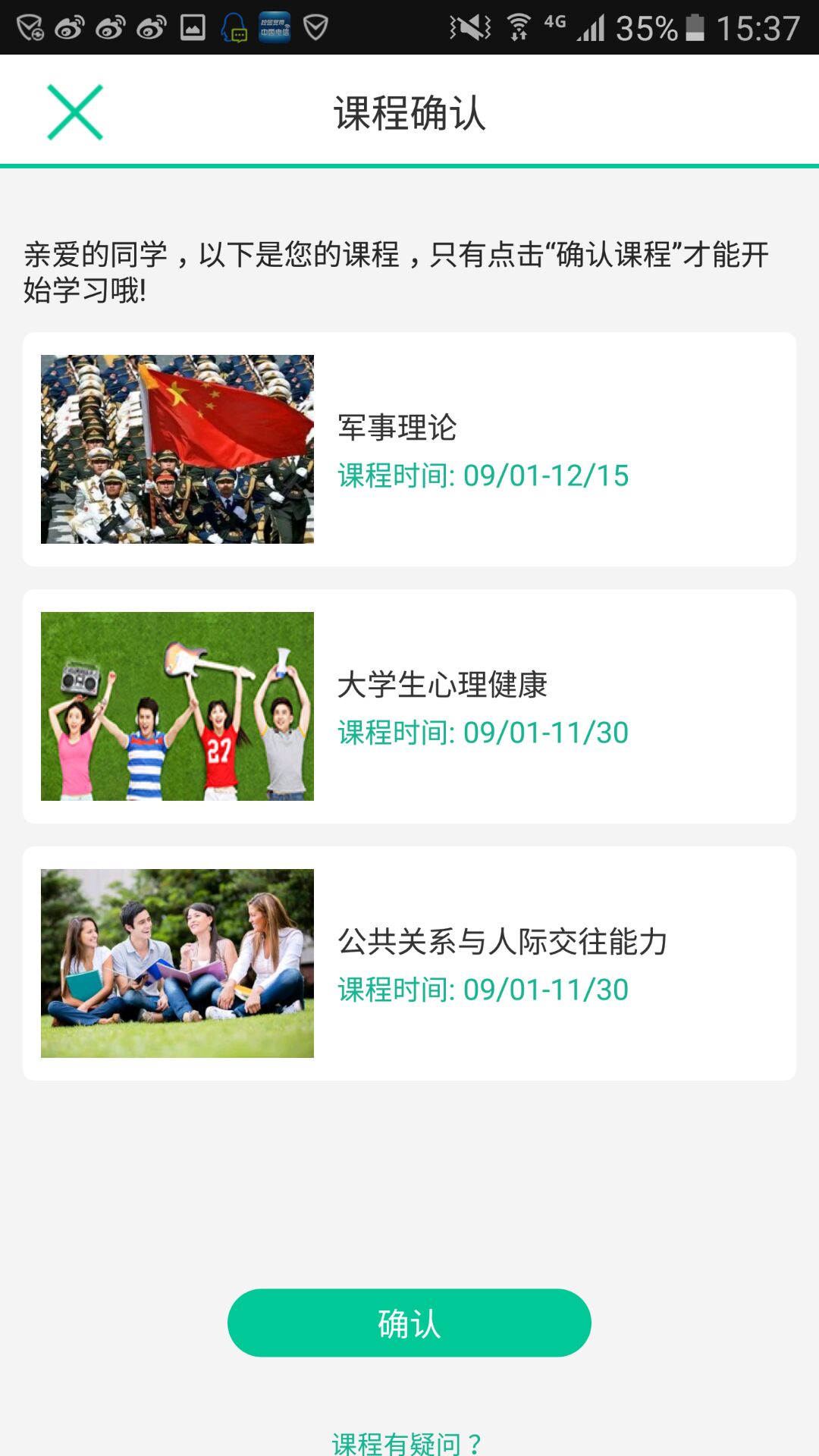 根据提示,用“学号登录”,选择学校、输入学号、初始密码是123456,首次登陆后,验证手机,输入新密码,即可报到成功。在确认课程界面(例图如下)