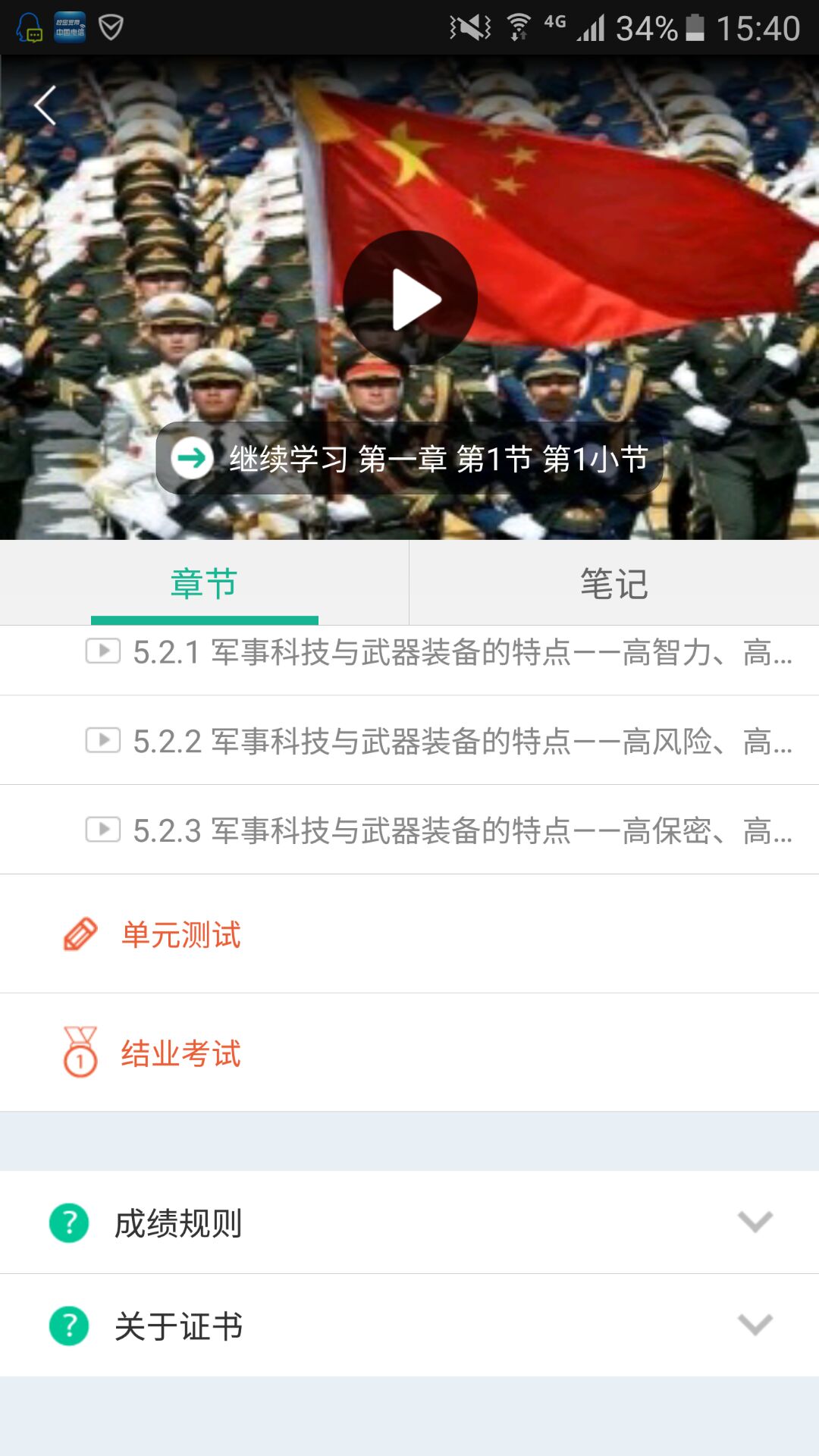 在“我的课程”中,点击“军事理论”,在弹出的页面中,上方为课程视频界面,点击即可播放视频、学习。下方为课程章节进度表,请按照进度表顺序学习。