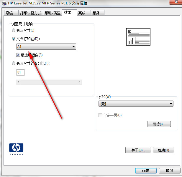 在Word2010下,打印前先选择“文件”——“打印”,再点击“打印机属性”,“效果”选项卡选择将文档打印在A4纸上,并勾选“缩放以适合”。