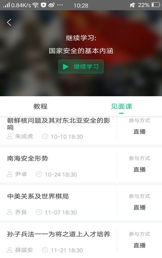 本课程有见面课,即网络课程教师将通过直播的方式授课,学生可以通过论坛与教师实时互动。见面课时间如下: