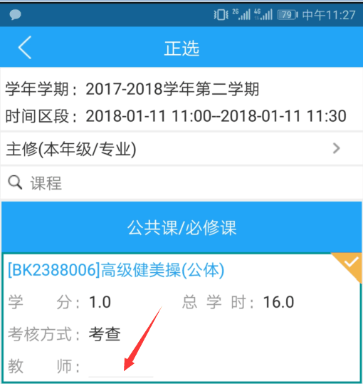 特别提醒:手机端选课,正选功能检索出待选课程后,需先点击教师后面的横线,选择上课班级和任课教师后,再提交数据。(如下图)
