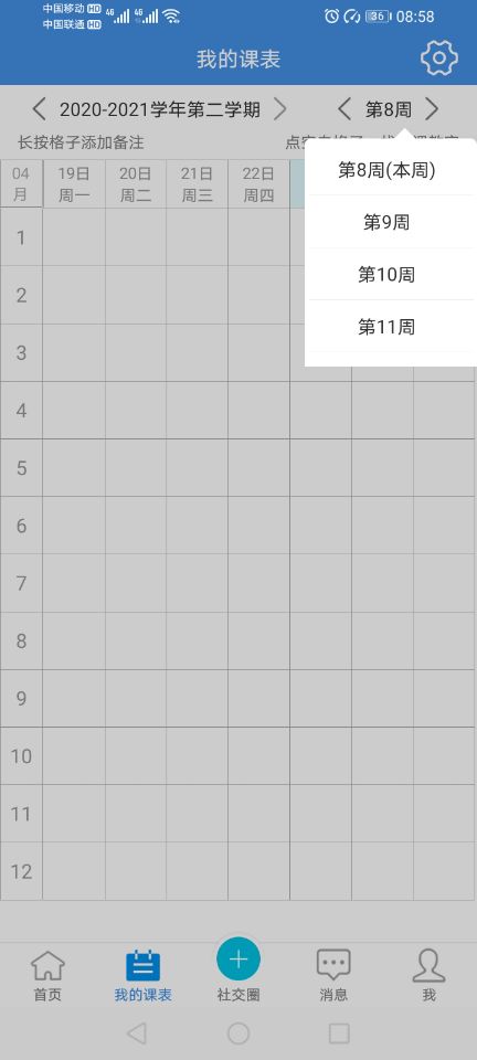 教务系统手机APP喜鹊儿,“我的课表”模块,可手动切换周次,实现本学期任意周次课表查看。