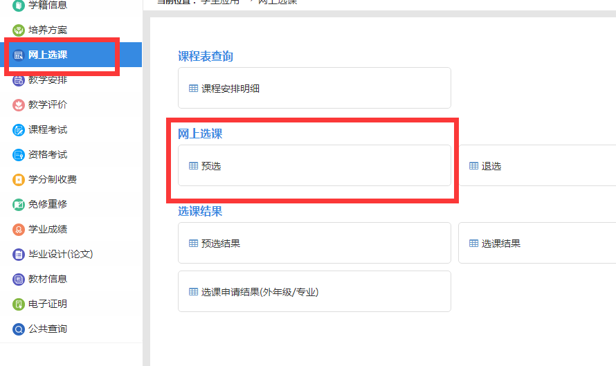 请访问教务系统http://jwxt.sdwu.edu.cn,通过“网上选课,预选,预选菜单”进行。课程检索范围为“主修(本年级/专业)”。选课结果及退选通过“预选结果菜单”进行查询。