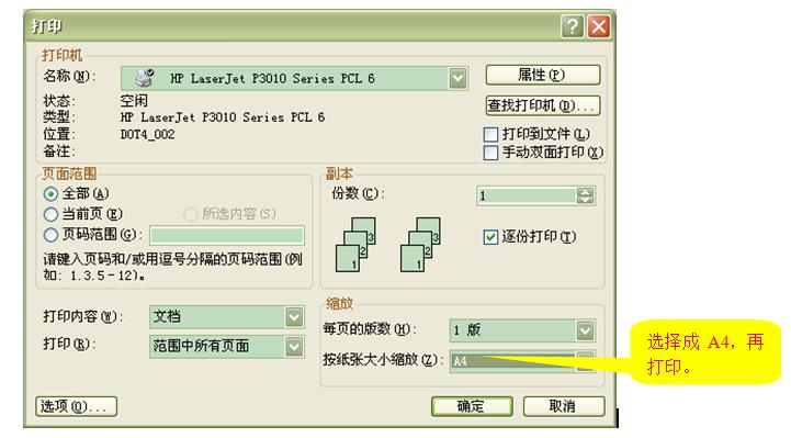 举例:在Word2003下,打印前先选择“文件”——“打印”(如下图所示),在“打印”对话框下“按纸张大小缩放”选项中,选择A4,再打印。