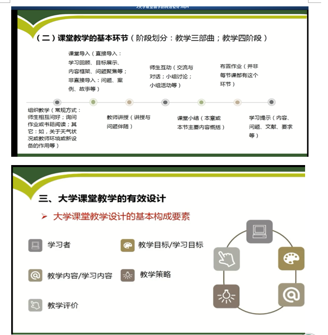 活动共分两个阶段:第一阶段是观看陕西师范大学教授、博士生导师陈晓端老师所讲授的“大学课堂教学的有效设计”网络课程。陈老师从课程与教学论专业的视角,对“大学课堂、大学课堂教学环节、大学课堂教学的有效设计”三个方面的内容进行了阐释,时间虽不长,但内容丰富,大家边听边笔记的认真态度体现了我校教师们爱学与渴望提升自我教学能力的心境。