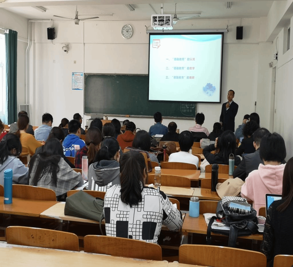 苗博士主要从“德融教育”的认知、“德融教育”的教学、“德融教育”的教研三个方面为大家进行了详细的剖析和展示。苗博士借助身边的教育案例启发大家思考:为什么需要更加重视德融教育?如何提高德融教育的主动意识?通过对相关案例的展示、分析和延伸思考,苗博士为在场教师厘清了“德融教育”的必要性和紧迫性问题,还从课程建设、课堂教学、课外辅导三个方面,借助于他自身近几年“德融教育”课程教学心得体会和经验教训,进行了具体明确、逻辑严谨、层次清晰的讲解,现场展示了自己多年来积累的设计思路和详实具体的课程教案。